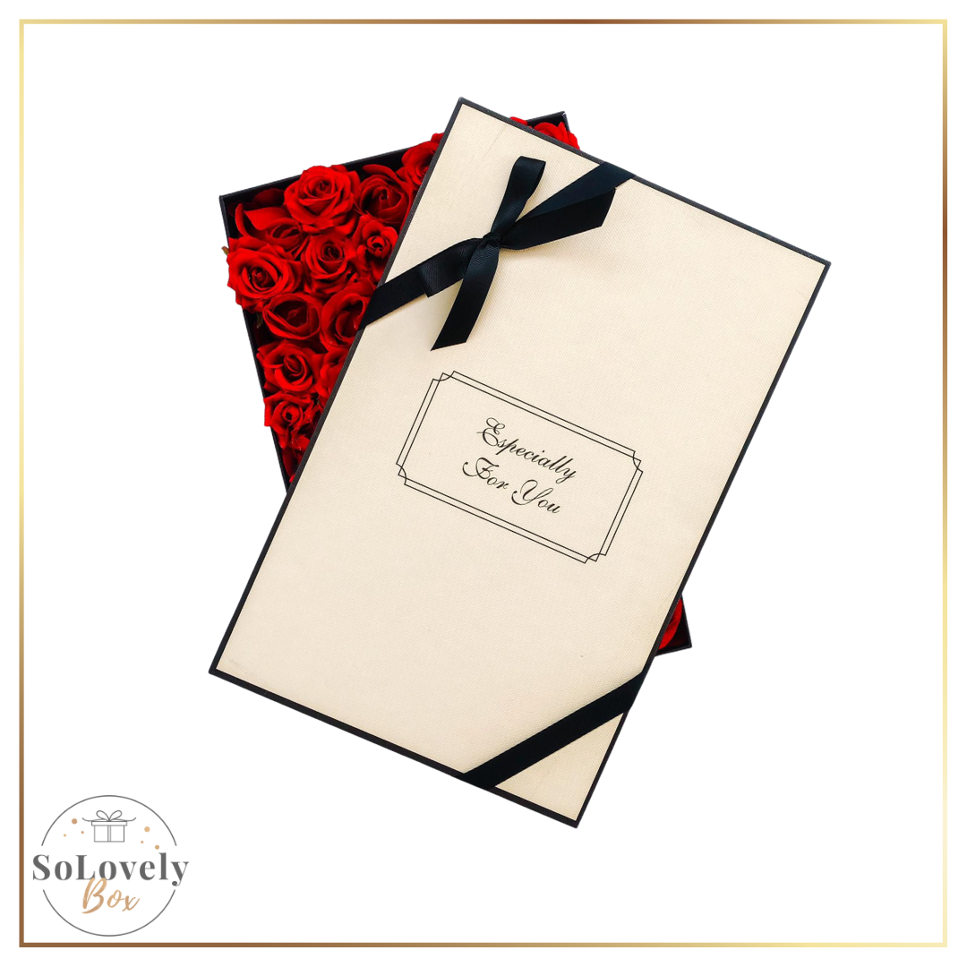 Cremefarbene Geschenkbox mit der Aufschrift ‚Especially for you’ mit eleganter Schleife & roten Seidenrosen im Innere