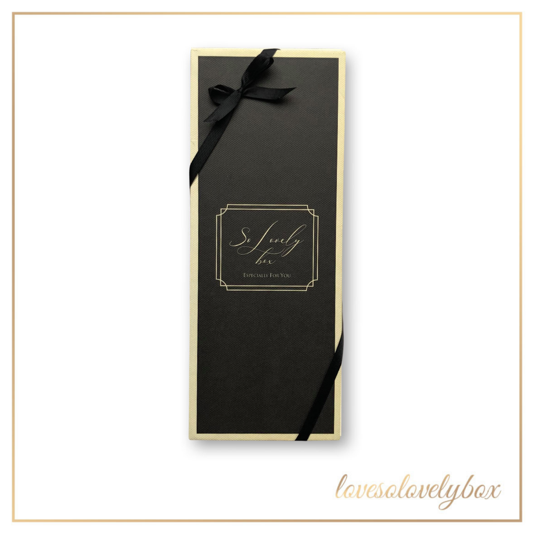 Die Flasche ist in eine weiße Geschenkbox mit lachsfarbenem Deckel und der Aufschrift Especially For You oder in eine schwarze Box mit der Aufschrift So Lovely Box und einer eleganten Schleife verpackt.