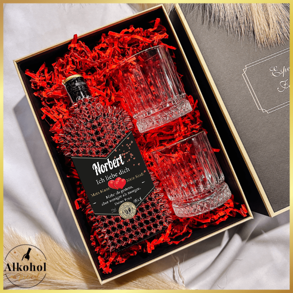 Ein Geschenkset zum Valentinstag für ihn ist der perfekte Weg, um Ihre Liebe und Wertschätzung auszudrücken. Ein sensationelles und originelles Geschenk! Der einzigartige Alkohol mit roten Stacheln wird buchstäblich jeden begeistern! Ein perfektes Geschenk für jeden Anlass, das mit Ihnen im Hinterkopf kreiert wurde. Die Flasche ist handdekoriert, wir achten auf die Ästhetik und die Verarbeitung in höchstem Maße. WOW-Effekt garantiert! Das exklusive Alkohol-Set in Kombination mit den Gläsern verleiht diesem Geschenk noch mehr Klasse. Und mit den beiden Gläsern können Sie das Getränk gemeinsam genießen. Die Flasche ist zudem elegant verpackt.