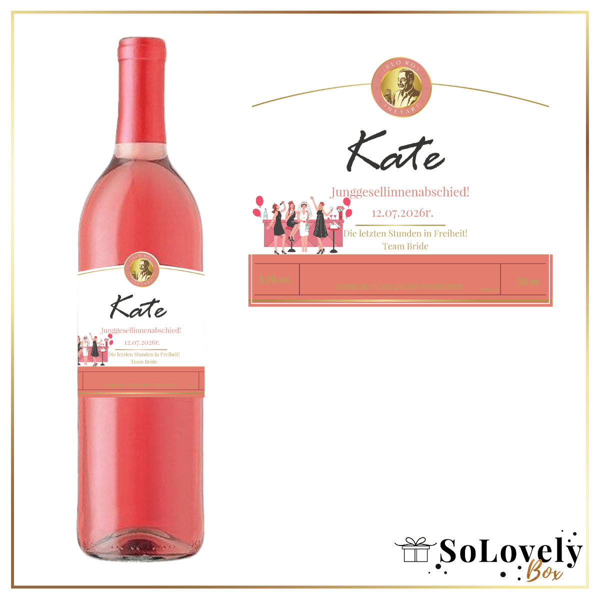 Süßer Roséwein mit personalisiertem Etikett ist das perfekte Geschenk für den Junggesellinnenabschied, das die zukünftige Braut und ihr Team begeistern wird.